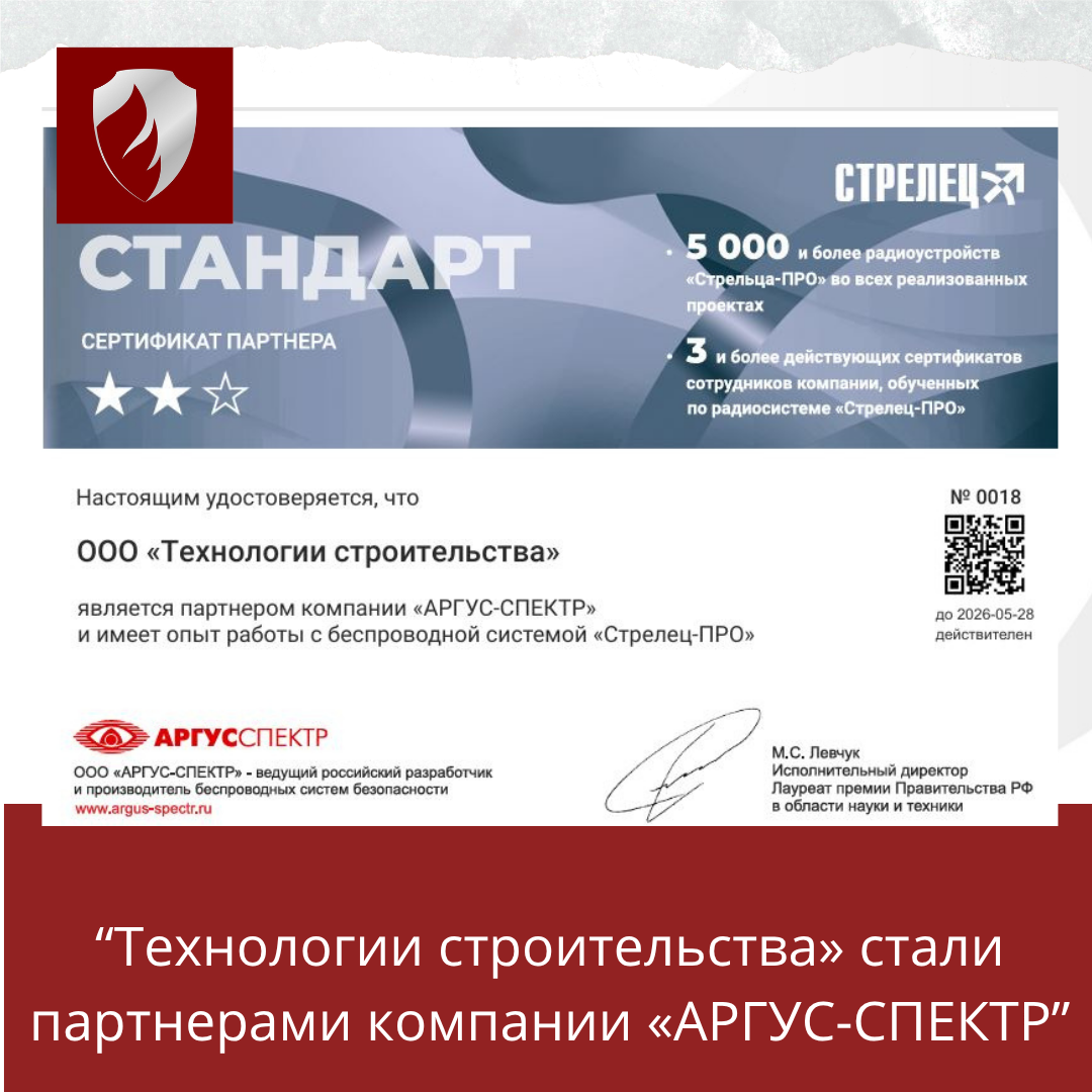 Еще одни члены Ассоциации РОПБ зачислены в клуб партнеров компании «АРГУС-СПЕКТР». Компания «Технологии строительства» имеет опыт работы с беспроводной системой «Стрелец-ПРО» и недавно получила сертификат, подтверждающий почетный статус компании «АРГУС-СПЕКТР».