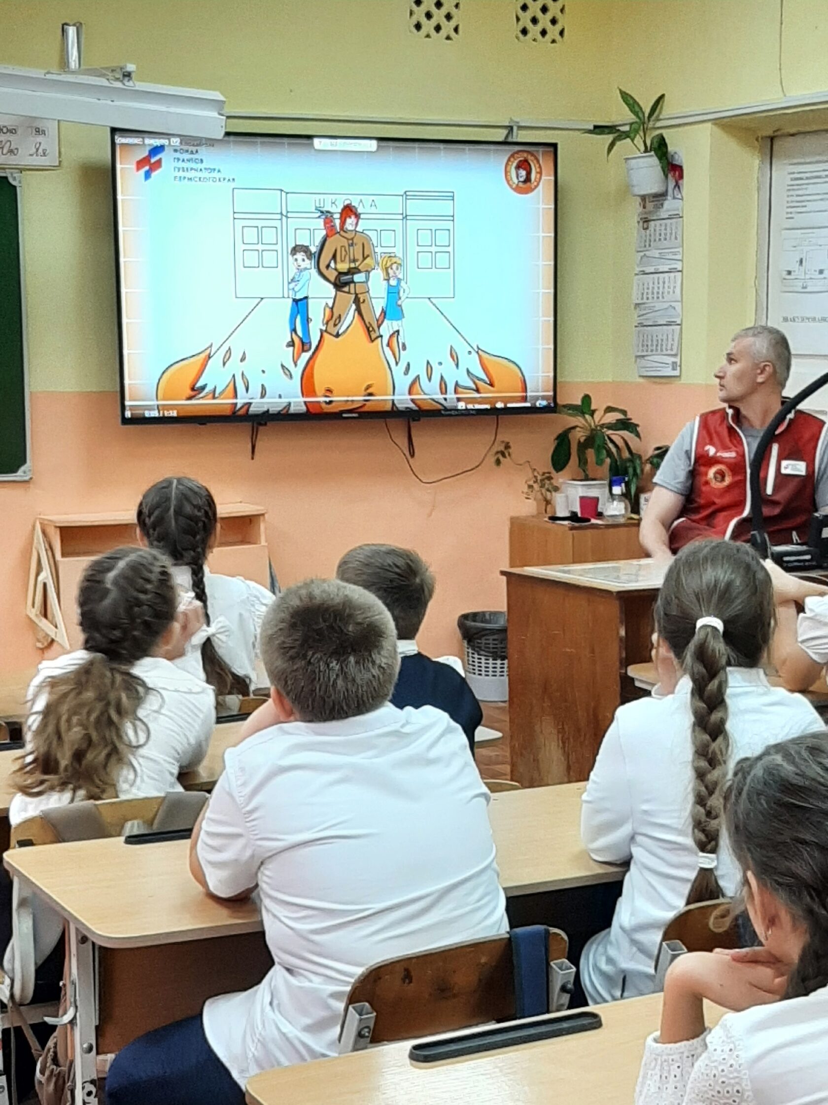 Финальную точку в игре этого года поставили в Соликамске. С правилами поведения при пожаре и этапами эвакуации из задымленного помещения познакомились учащиеся школы № 4.
